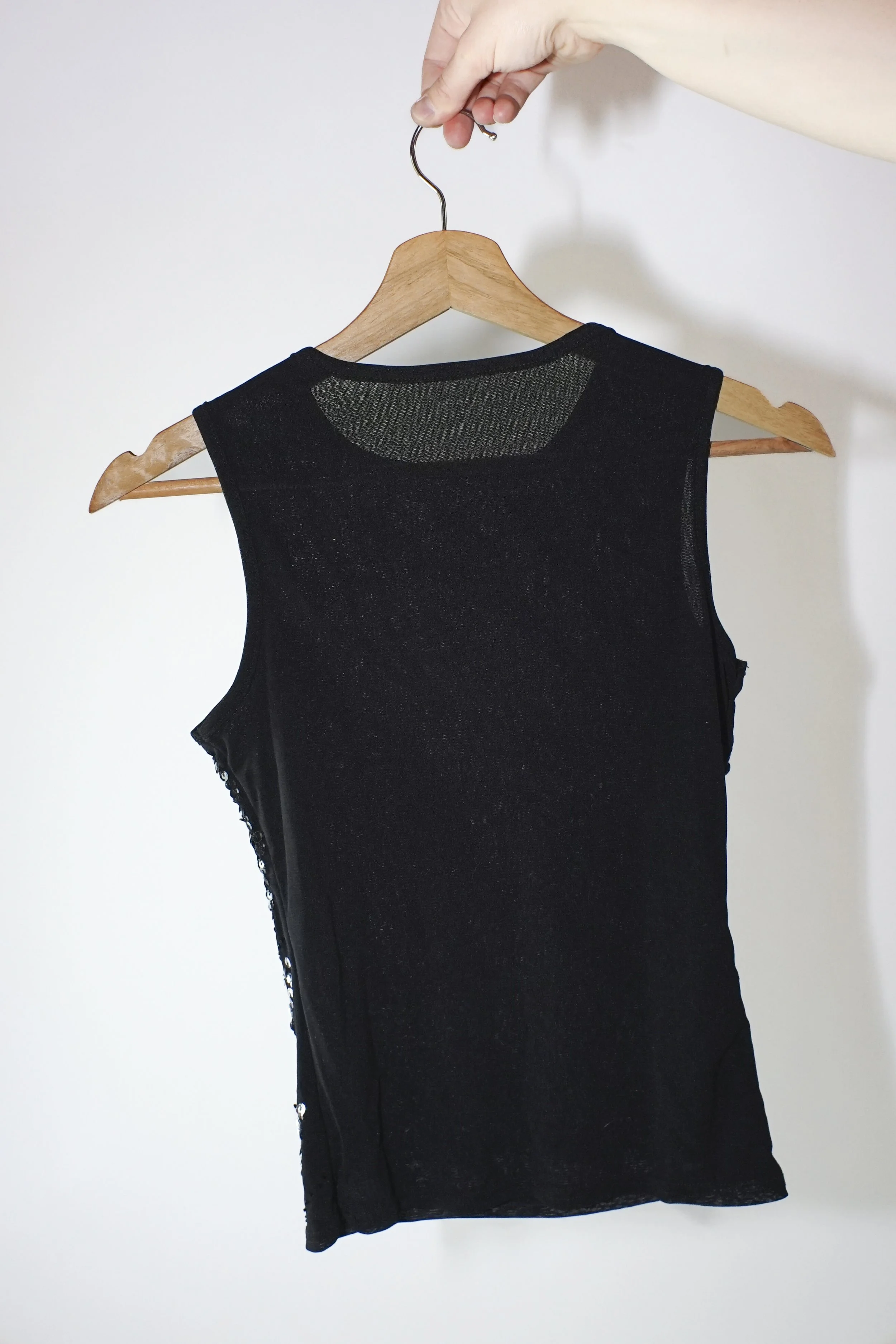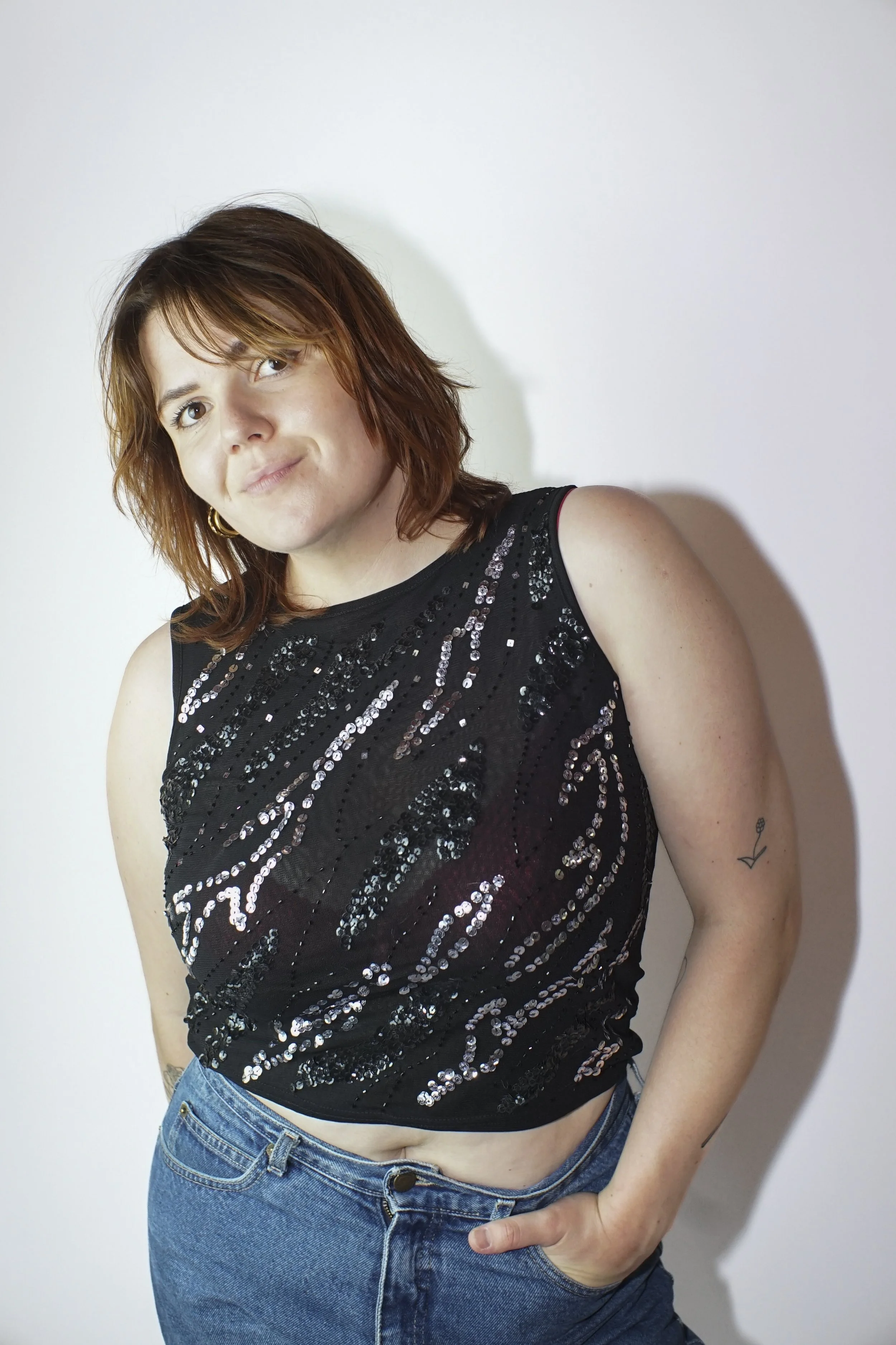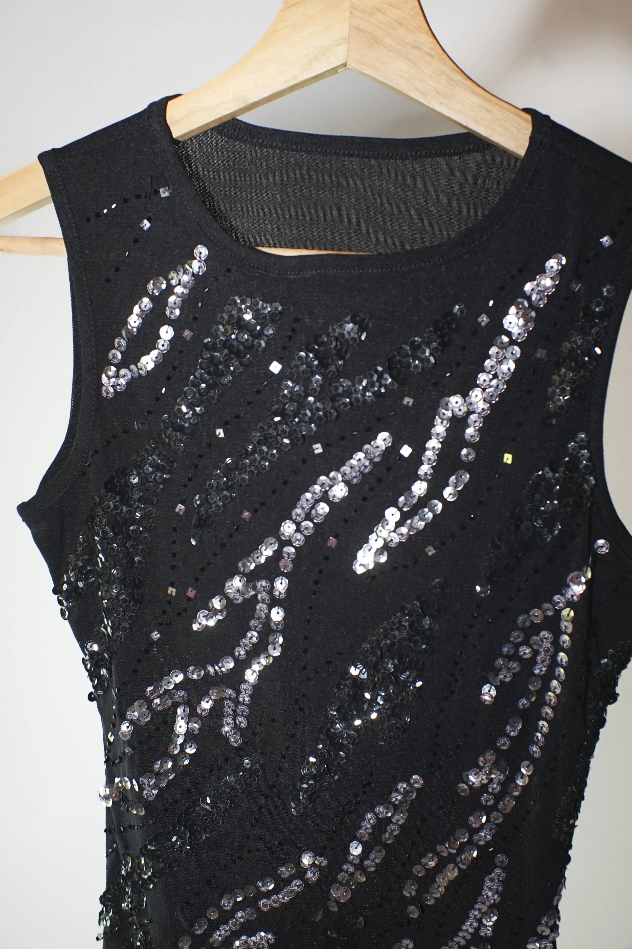 Feest sferen gegarandeerd met deze Y2K top vol zilveren pailletten en zwarte kraaltjes. De doorschijnende mesh, de vierkante kralenpatronen en het subtiele glinsteren maken dit de ultieme uitgaanstop. Hij heeft een licht stretchy fit en sluit mooi aan zonder te strak te zitten. Draag ‘m met een wijde jeans of juist over een slipdress voor dat echte Y2K-effect.